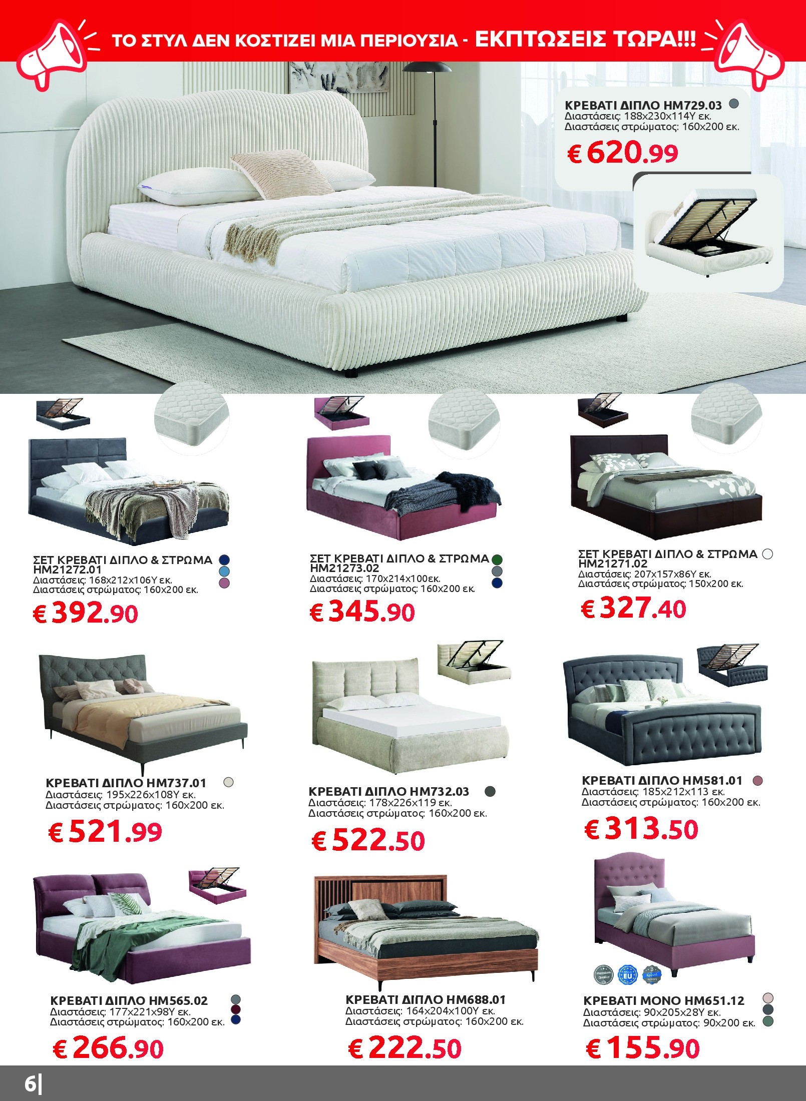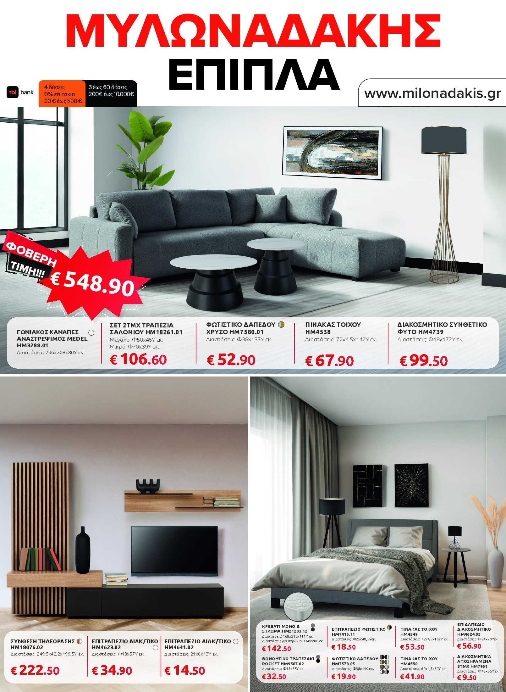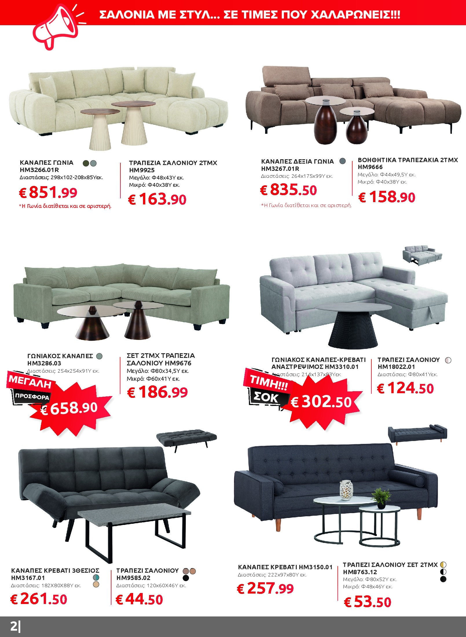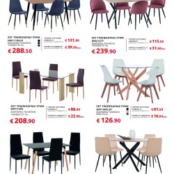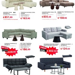 Αν ψάχνετε να ανανεώσετε το καθιστικό σας, θα βρείτε γωνιακούς καναπέδες, πολυμορφικά σετ και βοηθητικά τραπεζάκια που συνδυάζουν άνεση και σύγχρονο design. Για το υπνοδωμάτιο, οι προσφορές περιλαμβάνουν πλήρη σετ κρεβατιών με στρώμα και κομψές ντουλάπες σε διαφορετικά σχέδια και διαστάσεις, ενώ στην τραπεζαρία ξεχωρίζουν τα σετ 5 τεμαχίων με μοντέρνες καρέκλες και ανθεκτικές επιφάνειες.