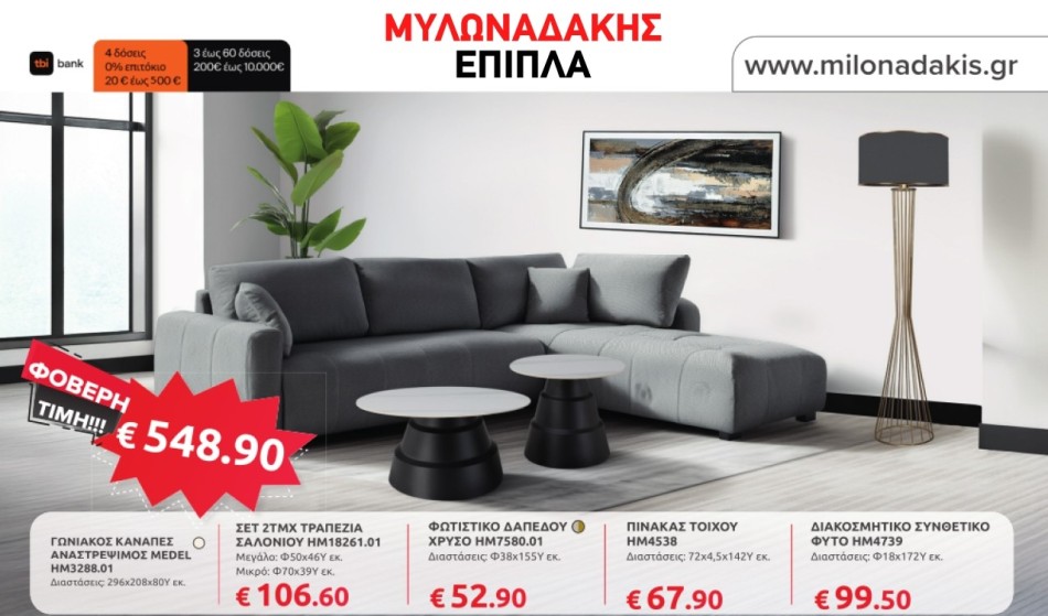 Η Black Friday φτάνει στα Έπιπλα Μυλωναδάκης με εκπτώσεις που δεν αφήνουν κανέναν ασυγκίνητο! Στο νέο φυλλάδιο θα βρείτε εντυπωσιακές προσφορές σε έπιπλα για κάθε χώρο του σπιτιού — από καναπέδες και τραπεζάκια σαλονιού μέχρι κρεβάτια, τραπεζαρίες και γραφεία εργασίας.