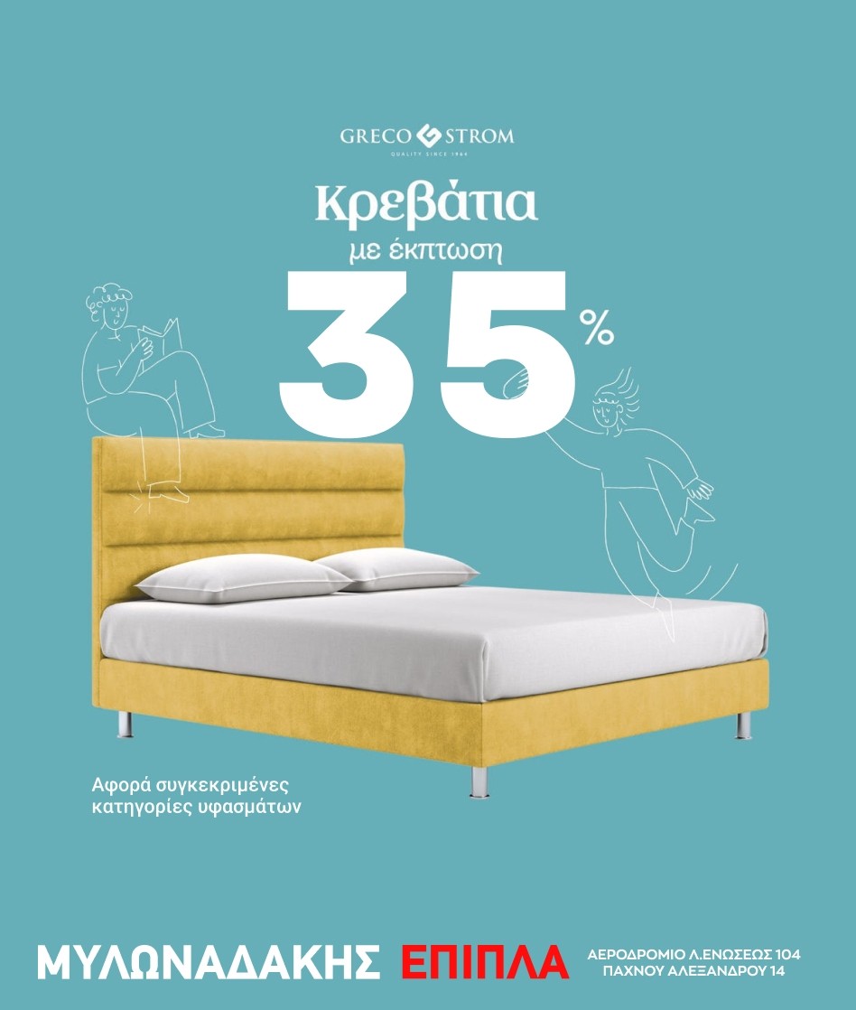 Από τις 14 έως τις 24 Μαρτίου, με αφορμή την Παγκόσμια Ημέρα Ύπνου, τα Έπιπλα Μυλωναδάκης σας προσκαλούν να επωφεληθείτε από έκπτωση 45% στη νέα σειρά στρωμάτων Bodytopia και 35% σε επιλεγμένα κρεβάτια Greco Strom, σε ειδικά υφάσματα. Επιπλέον, με κάθε αγορά κρεβατιού και στρώματος Greco Strom, παίρνετε δώρο αξίας 200€!