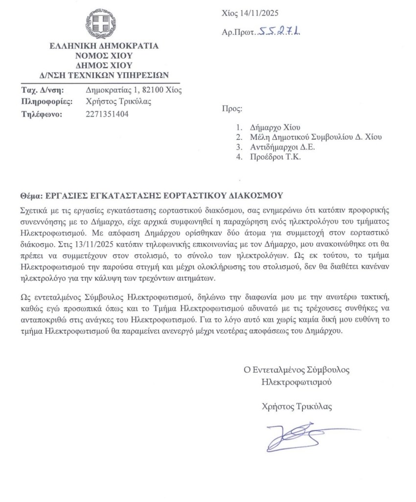 Νέες ρωγμές στη συνοχή της Δημοτικής Αρχής Χίου αποκαλύπτει επιστολή- καταγγελία του εντεταλμένου συμβούλου Ηλεκτροφωτισμού Χρήστου Τρικύλα, προς τις υπηρεσίες του Δήμου, στην οποία διατυπώνει με σαφήνεια τη διαφωνία του με τον Δήμαρχο Χίου Γιάννη Μαλαφή για τον τρόπο που αποφασίστηκε να πραγματοποιηθούν οι εργασίες εγκατάστασης του εορταστικού διακόσμου.