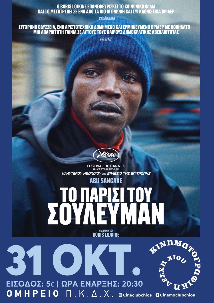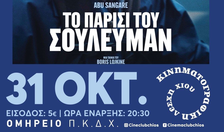 Με μια δυνατή κινηματογραφική πρόταση συνεχίζονται οι προβολές στο Ομήρειο Πνευματικό Κέντρο Δήμου Χίου, την Παρασκευή 31 Οκτωβρίου 2025, στις 20:30. Το κοινό θα έχει την ευκαιρία να παρακολουθήσει την ταινία «Το Παρίσι του Σουλεϊμάν» (L’histoire de Suleïman), ένα κοινωνικό δράμα που έχει αποσπάσει διεθνείς διακρίσεις και αναγνωρίζεται ως μία από τις πιο ουσιαστικές και ανθρώπινες κινηματογραφικές καταθέσεις της χρονιάς.