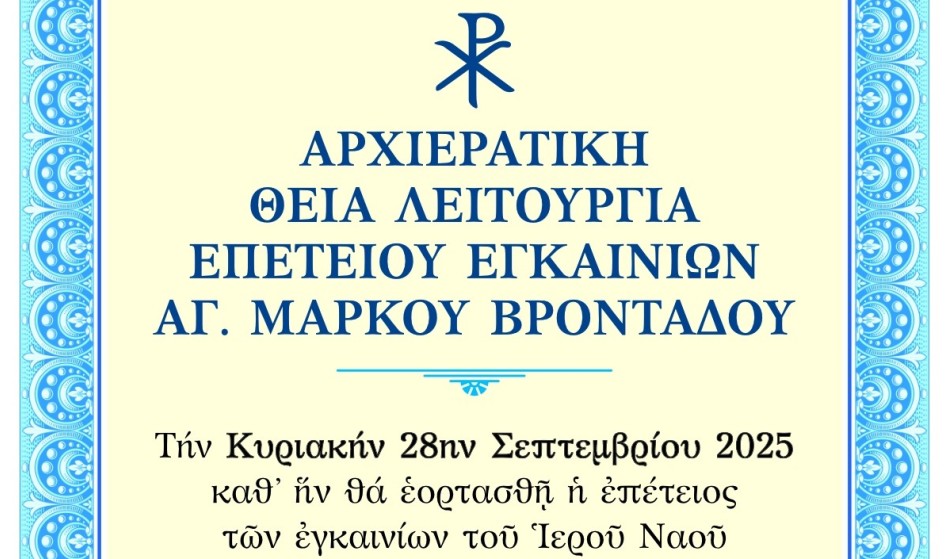 Την Κυριακή 28 Σεπτεμβρίου 2025 θα τελεστεί με ιδιαίτερη λαμπρότητα η επέτειος εγκαινίων του Ιερού Ναού Αγίου Μάρκου Βροντάδου.