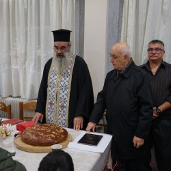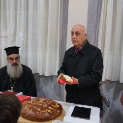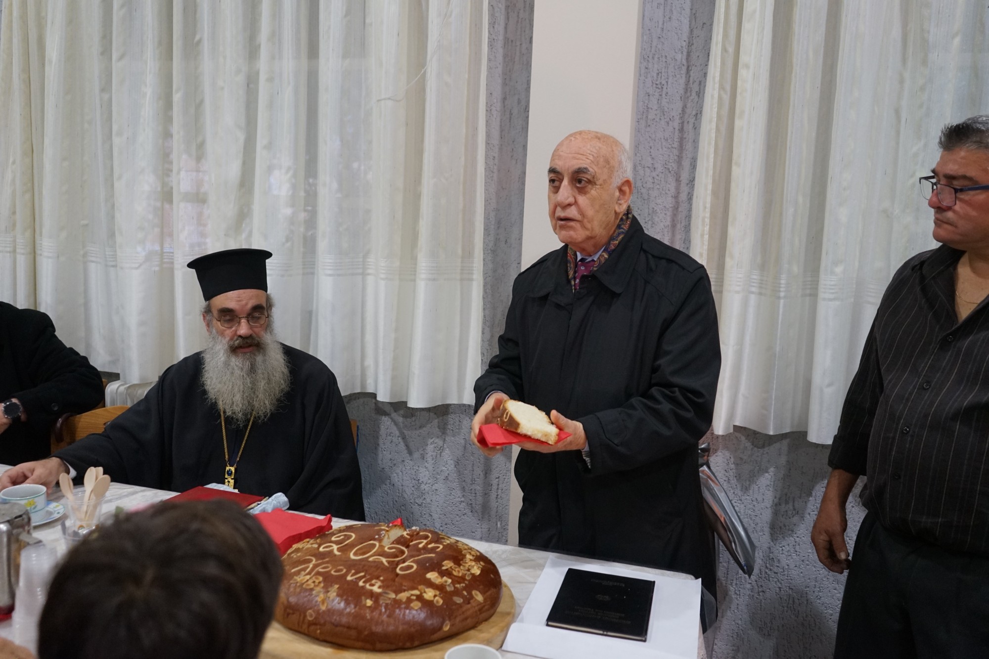Αμέσως μετά την πανηγυρική Θεία Λειτουργία, το εκκλησίασμα, οι φίλοι και τα μέλη του Τάγματος, μαζί με το Διοικητικό Συμβούλιο και τον Πρόεδρο Βασίλη Σαρμουσάκη, συγκεντρώθηκαν στην αίθουσα συνεστιάσεων για την κοπή της βασιλόπιτας. Η φετινή εκδήλωση είχε έναν ιδιαίτερα συγκινητικό χαρακτήρα, καθώς πραγματοποιήθηκε τιμητική απονομή σε πρόσωπο που έχει προσφέρει καθοριστική βοήθεια στο έργο του Τάγματος.
