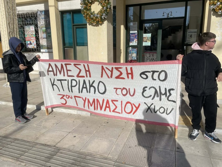 Μια ηχηρή κινητοποίηση πραγματοποιήθηκε σήμερα στο δημαρχείο Χίου, με μαθητές, γονείς και καθηγητές του 3ου Γυμνασίου Χίου να ενώνουν τις φωνές τους διεκδικώντας ξεκάθαρες απαντήσεις και πολιτικές δεσμεύσεις για το κτιριακό πρόβλημα που ταλανίζει εδώ και χρόνια το σχολείο τους.