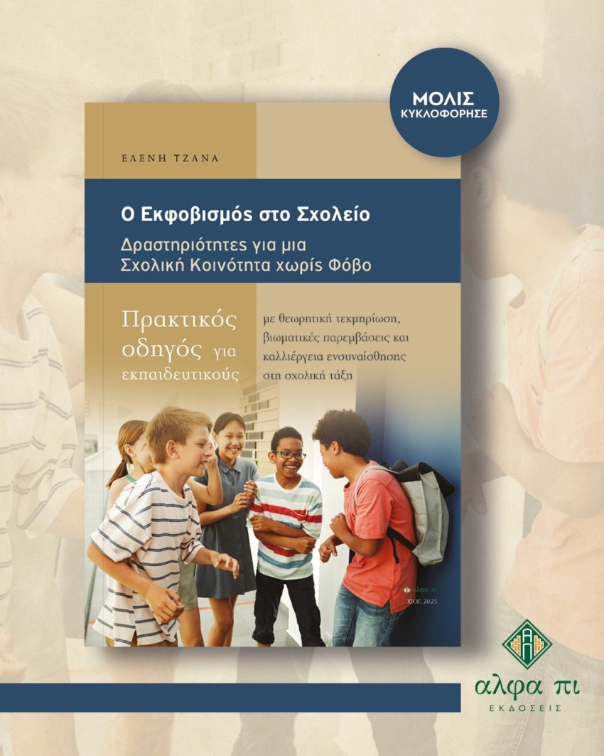 Κυκλοφόρησε από τις εκδόσεις «Άλφα Πι» το βιβλίο της Ελένης Τζάνα με τίτλο «Ο Εκφοβισμός στο Σχολείο: Δραστηριότητες για μια Σχολική Κοινότητα χωρίς Φόβο». Πρόκειται για έναν επιστημονικά τεκμηριωμένο και παιδαγωγικά ολοκληρωμένο οδηγό, που φιλοδοξεί να αποτελέσει σημείο αναφοράς στην πρόληψη και τη διαχείριση του σχολικού εκφοβισμού.