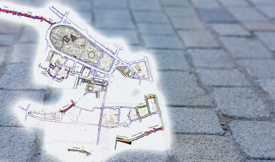 Αντικατάσταση υλικών: κυβόλιθοι 10×20×7εκ., χυτό βοτσαλωτό δάπεδο, κυβόλιθοι Καβάλας σε κάνναβο ανά 2,80μ., κράσπεδα από πέτρα Λαγκάδας.