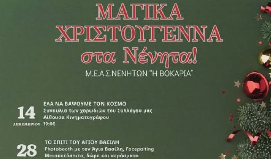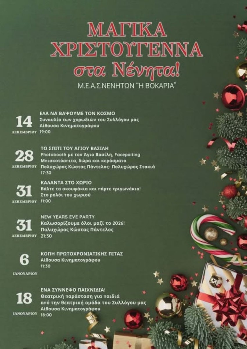 Ο Μορφωτικός, Εκπολιτιστικός και Αθλητικός Σύλλογος Νενήτων "Η Βοκαριά" ανακοινώνει το πρόγραμμα των εορταστικών εκδηλώσεων στα Νένητα. Με γιορτινή διάθεση και λαμπερά χαμόγελα, οι κάτοικοι και επισκέπτες καλούνται να βιώσουν τη μαγεία των εορτών στην περιοχή.