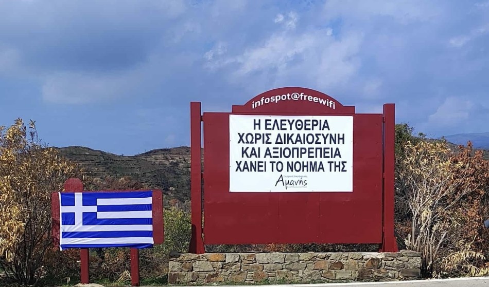 Στην είσοδο της Βολισσού, εκεί όπου αρχίζει η Αμανή, ένα νέο μήνυμα υποδέχεται από σήμερα τους επισκέπτες ενόψει της επετείου των Ελευθερίων της Χίου. Μια ελληνική σημαία κυματίζει πλάι σε ένα πανό που γράφει: