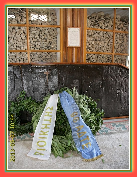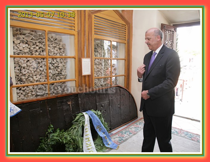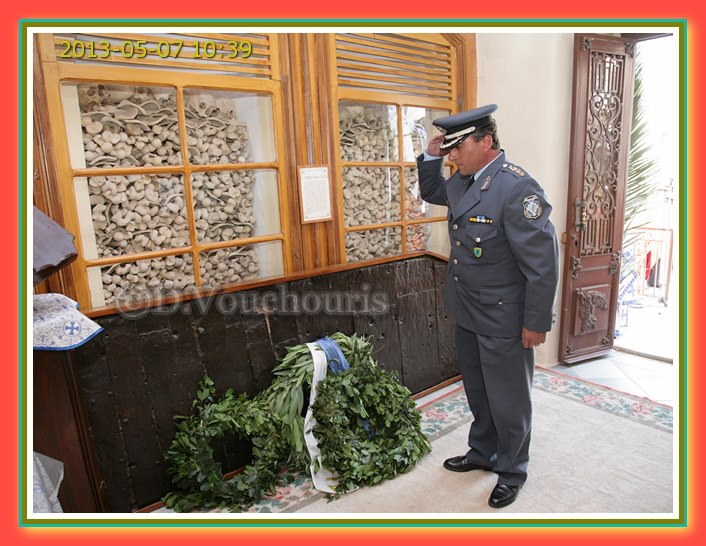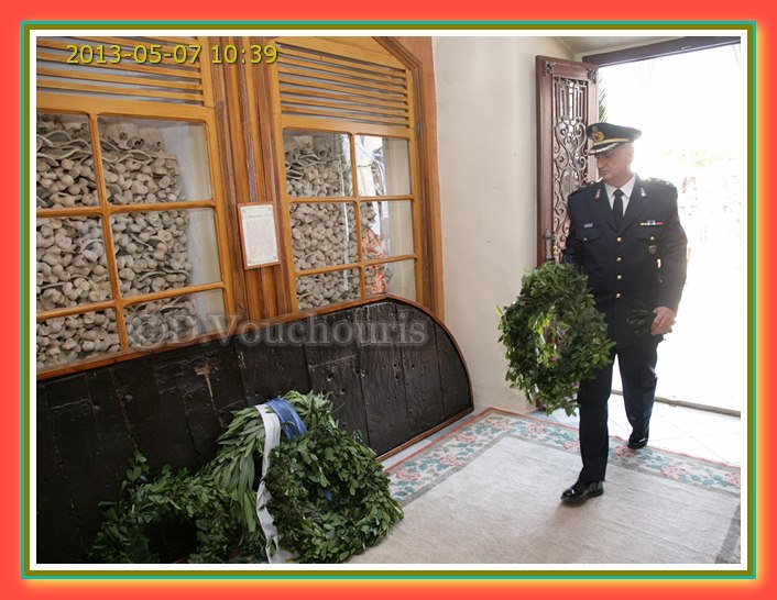 Η πολιτική και στρατιωτική ηγεσία του τόπου μετά την ακολουθία και το τρισάγιο που τελέσθηκε παρουσία του Μητροπολίτη Χίου κ. Μάρκου, κατέθεσαν στεφάνια στο χώρο όπου φυλάσσονται τα οστά των σφαγιασθέντων.