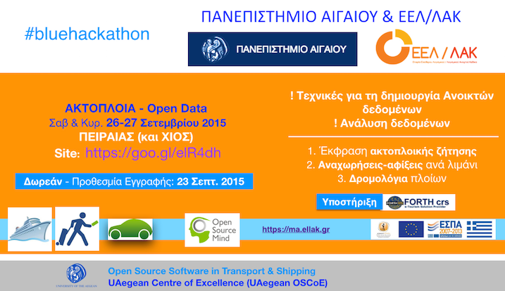 Την ευκαιρία να παρακολουθήσουν ζωντανά την ακτοπλοϊκή κίνηση στο Αιγαίο και να πληροφορηθούν τα πάντα αναφορικά με τα δρομολόγια και τα δεδομένα, μέσα από αναλύσεις και παρουσιάσεις, θα έχουν όσοι βρεθούν στις 26 και 27 Σεπτεμβρίου στο Πανεπιστήμιο Αιγαίου στη Χίο, όπου θα πραγματοποιηθεί το «BLUE HACATHON» με θέμα τη δημιουργία ανοικτών δεδομένων (open data) στις επιβατικές μεταφορές στο Αιγαίο, και την ανάπτυξη μεθόδων και εφαρμογών που χρησιμοποιούν ανοικτά δεδομένα.