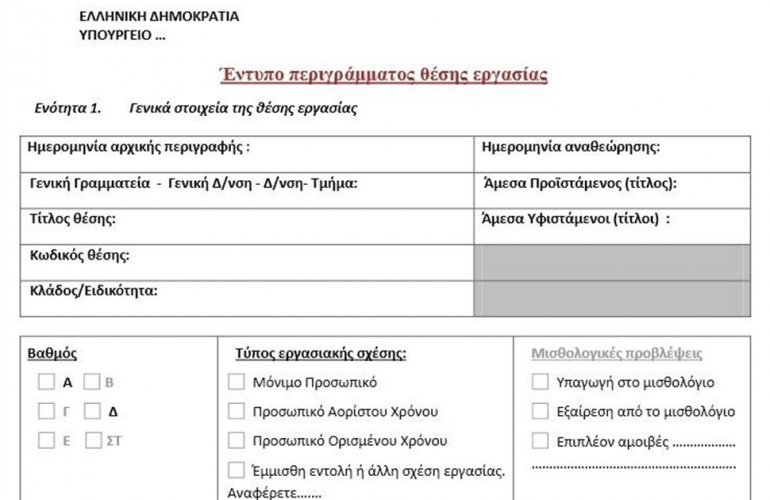Στα χέρια των πρώτων δημοσίων υπαλλήλων θα βρεθεί εντός ημερών το ερωτηματολόγιο για την "ανάλυση της θέσης εργασίας" τους, μέσα από το οποίο θα κληθούν να περιγράψουν αναλυτικά τη φύση και το σκοπό της εργασίας τους.