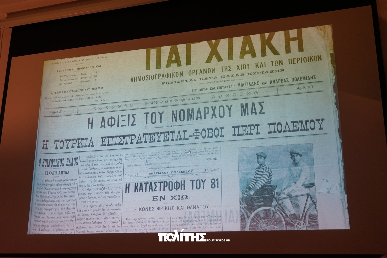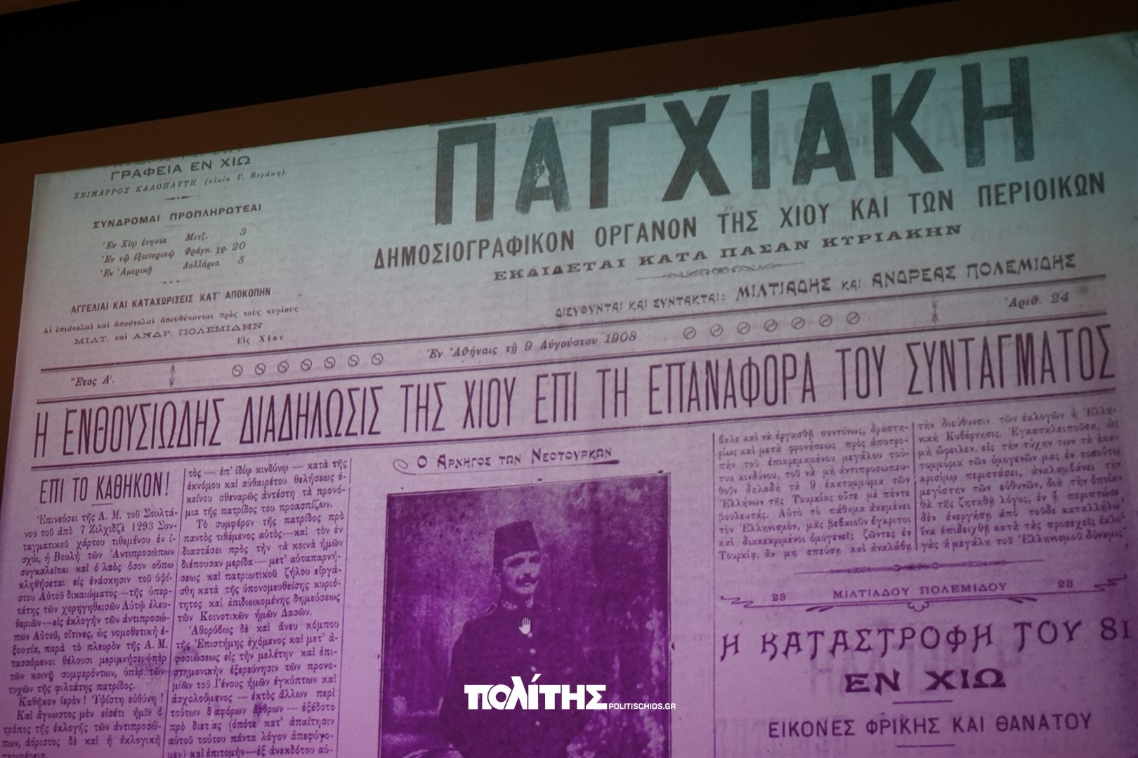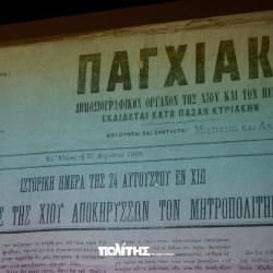 Η εκδήλωση ανέδειξε και τη σύνδεση της χιακής πολιτικής πραγματικότητας με τα εθνικά και διεθνή γεγονότα της εποχής: την ελεύθερη Αθήνα, την Κωνσταντινούπολη, την Ευρώπη. Την αφήγηση και ιστορική ανάλυση παρουσίασε ο Κώστας Ζαφείρης, σε μία εξαιρετικά γλαφυρή ομιλία, η οποία «με συνοπτικότητα και παραστατικότητα παρουσίασε μια άγνωστη πτυχή της ιστορίας μας». Το πλήρες βίντεο της εκδήλωσης είναι διαθέσιμο στην ηλεκτρονική σελίδα του «Πολίτη».
