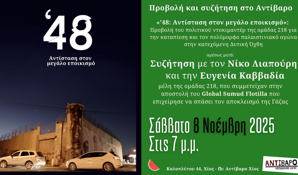 Το άγριο πρόσωπο της ισραηλινής κατοχής της Παλαιστίνης, αλλά και το ελπιδοφόρο μήνυμα της διεθνούς αλληλεγγύης, φιλοδοξεί να αναδείξει η διπλή εκδήλωση που διοργανώνει το προσεχές Σάββατο 8 Νοεμβρίου 2025 στις 7 το απόγευμα ο Κοινωνικός Χώρος Αντίβαρο. Η εκδήλωση θα ανοίξει με την προβολή του ντοκιμαντέρ «'48: Αντίσταση στον μεγάλο εποικισμό» (78') που γύρισε το καλοκαίρι του 2022 η Ομάδα 218 στην κατεχόμενη Δυτική Όχθη της Παλαιστίνης. Το ντοκιμαντέρ καταγράφει ιστορίες από 4 περιοχές της Παλαιστίνης, που καταλήγουν σε μια συλλογική αφήγηση της παλαιστινιακής αντίστασης ως καθημερινής πρακτικής. Γυναίκες, άνδρες και παιδιά μιλούν για τις απαγορεύσεις στις ελεύθερες μετακινήσεις, τις αρπαγές σπιτιών, τους εξευτελιστικούς ελέγχους στα checkpoints, τις φυλακίσεις και τις δολοφονίες.