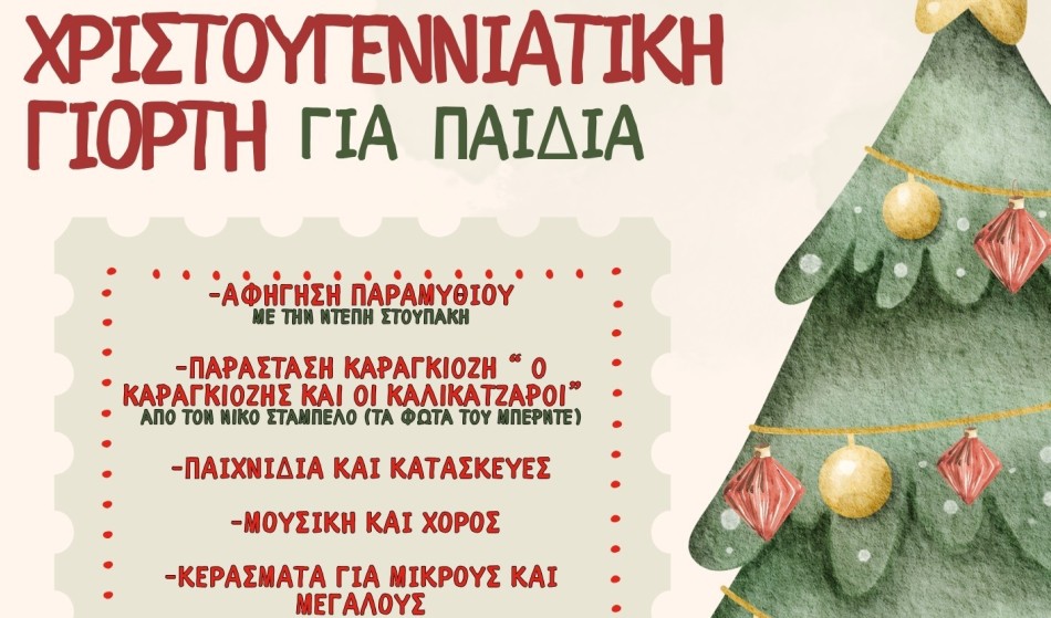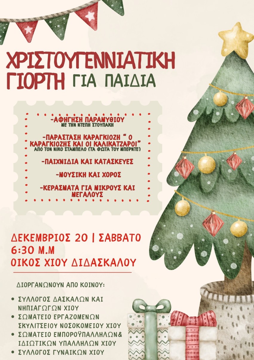 Σε μια προσπάθεια να εορταστούν τα Χριστούγεννα με έναν ιδιαίτερο και συλλογικό τρόπο, ο Σύλλογος Δασκάλων και Νηπιαγωγών Χίου «Ο Αδαμάντιος Κοραής» διοργανώνει μια ξεχωριστή εκδήλωση για τα παιδιά και τις οικογένειές τους. Η εκδήλωση θα πραγματοποιηθεί στις 20 Δεκεμβρίου, στις 6:30 μ.μ., στον Οίκο Χίου Διδασκάλου.
