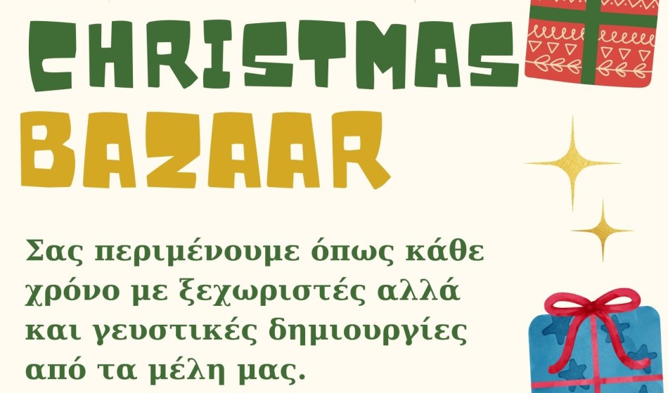 Το καθιερωμένο Χριστουγεννιάτικο Bazaar διοργανώνει για ακόμη μία χρονιά το Σωματείο Ατόμων με Σκλήρυνση Κατά Πλάκας Χίου, στο γνωστό περίπτερο των συνταξιούχων ΕΦΚΑ, απέναντι από την Περιφέρεια στην κεντρική πλατεία της πόλης. Η δράση θα πραγματοποιηθεί από την Παρασκευή 19 έως και την Τετάρτη 24 Δεκεμβρίου.