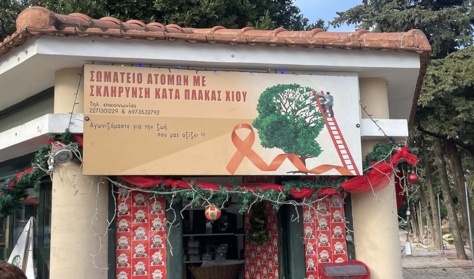 Με χειροποίητα γλυκά, καλαίσθητα λικέρ, πρωτότυπες δημιουργίες και πολύχρωμες ατζέντες, το Σωματείο Ατόμων με Σκλήρυνση Κατά Πλάκας Χίου πραγματοποιεί το καθιερωμένο χριστουγεννιάτικο μπαζάρ του, σε ένα σημείο που έχει γίνει θεσμός τα τελευταία χρόνια: το περίπτερο των συνταξιούχων του ΕΦΚΑ, απέναντι από την Περιφέρεια.