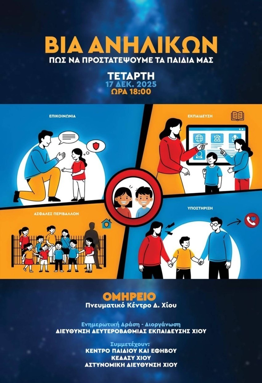 Μία ουσιαστική και απόλυτα επίκαιρη ημερίδα για τη βία μεταξύ ανηλίκων διοργανώνει την Τετάρτη 17 Δεκεμβρίου 2025, στις 18:00, η Διεύθυνση Δευτεροβάθμιας Εκπαίδευσης Χίου, στο Ομήρειο Πνευματικό Κέντρο.