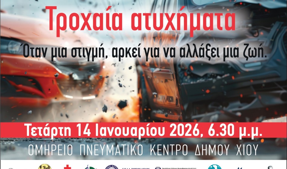 Η εκδήλωση θα πραγματοποιηθεί την Τετάρτη 14 Ιανουαρίου 2026, στις 6:30 μ.μ., στην Αίθουσα Συνεδρίων του Ομηρείου Πνευματικού Κέντρου Δήμου Χίου, φέροντας τον τίτλο: «Τροχαία ατυχήματα – Όταν μια στιγμή, αρκεί για να αλλάξει μια ζωή».