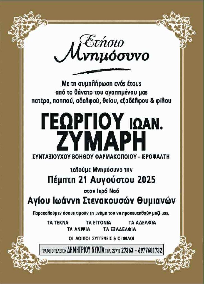 Τελούμε Μνημόσυνο την Πέμπτη 21 Αυγούστου 2025 στον Ιερό Ναό Αγίου Ιωάννη Στενακουσών Θυμιανών
