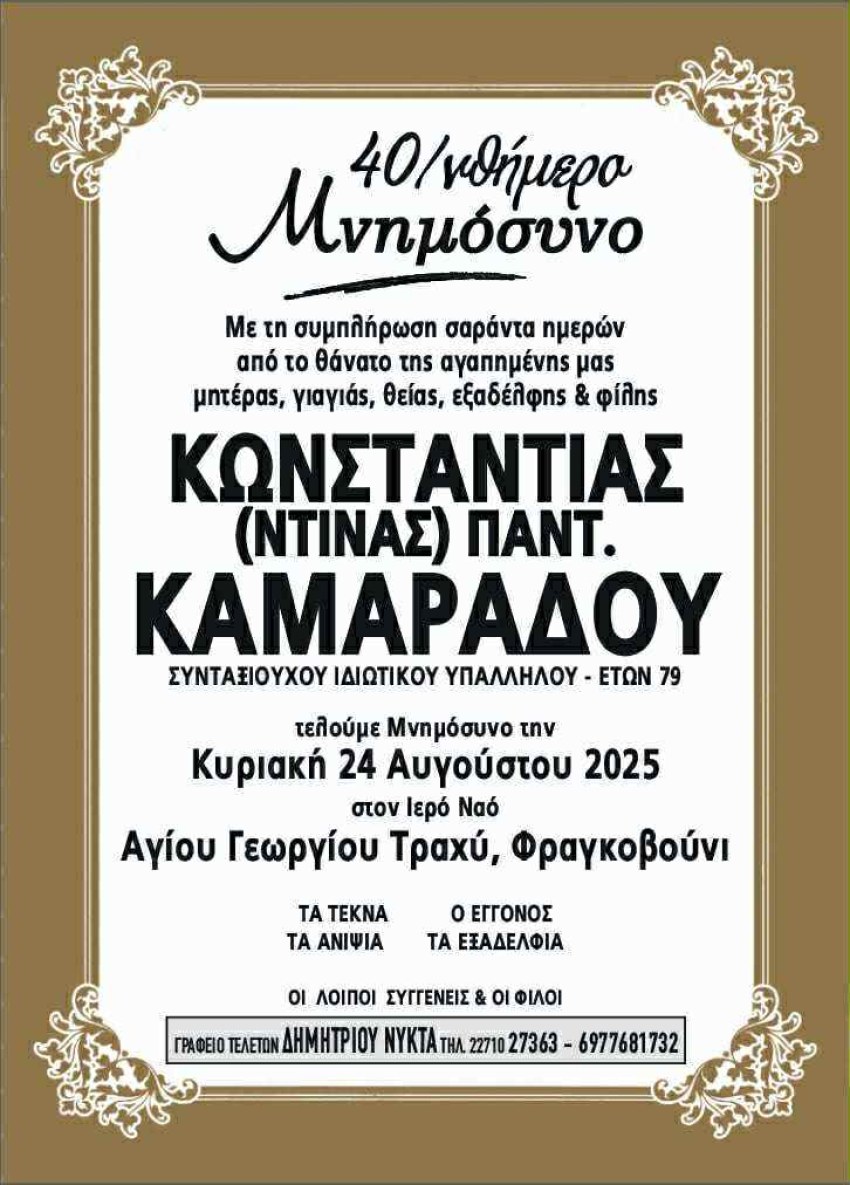 Τελούμε Μνημόσυνο την Κυριακή 24 Αυγούστου 2025 στον Ιερό Ναό Αγίου Γεωργίου Τραχύ, Φραγκοβούνι