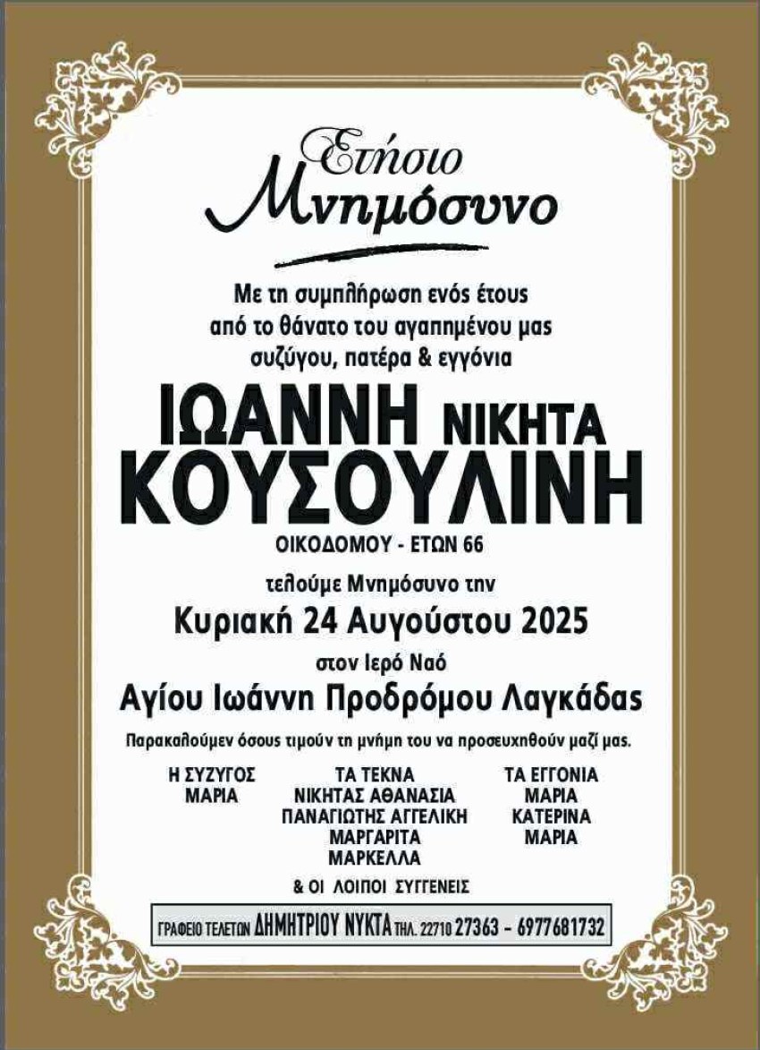 Τελούμε Μνημόσυνο την Κυριακή 24 Αυγούστου 2025 στον Ιερό Ναό Αγίου Ιωάννη Προδρόμου Λαγκάδας