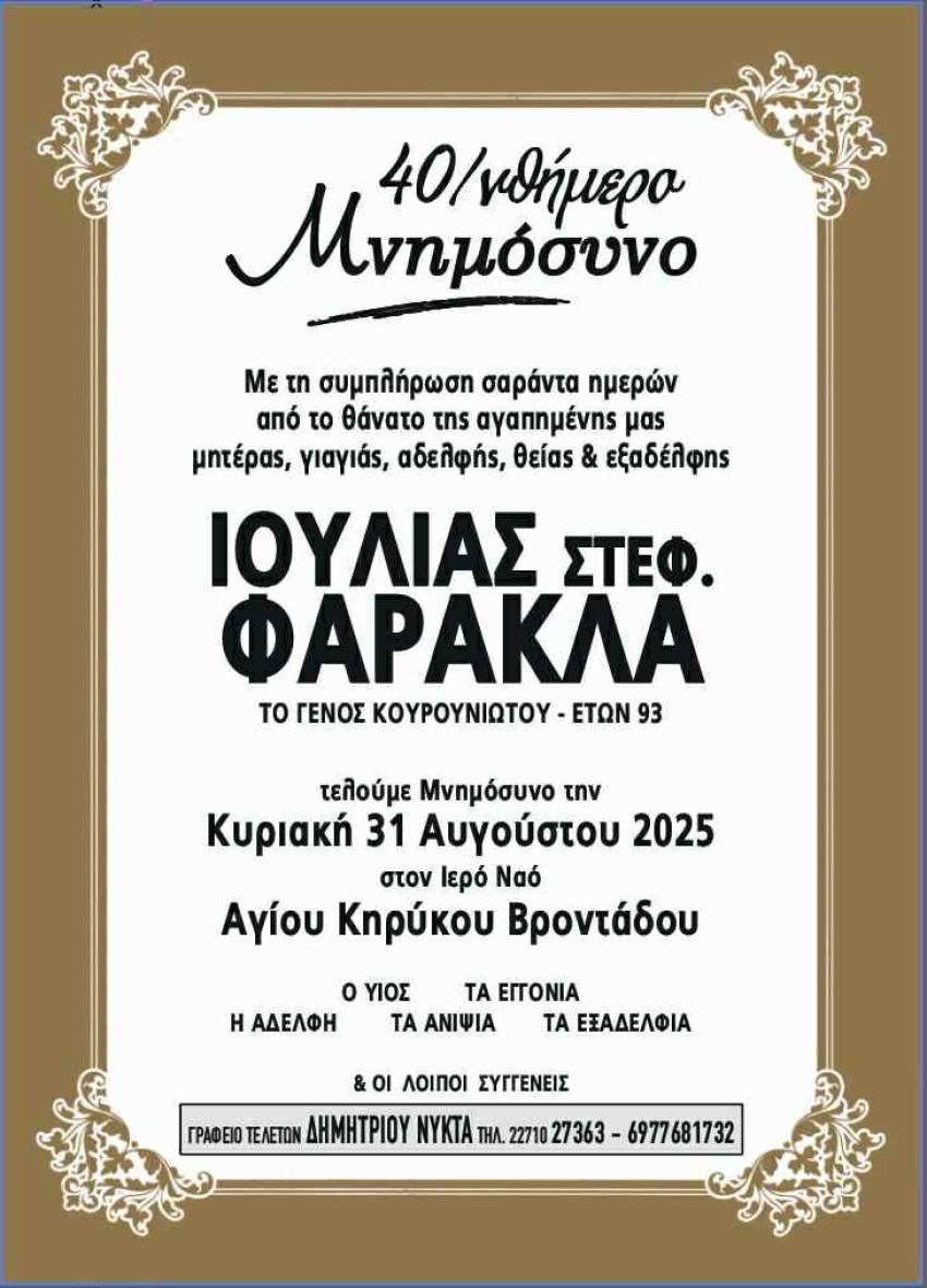 Τελούμε Μνημόσυνο την Κυριακή 31 Αυγούστου 2025 στον Ιερό Ναό Αγίου Κηρύκου Βροντάδου