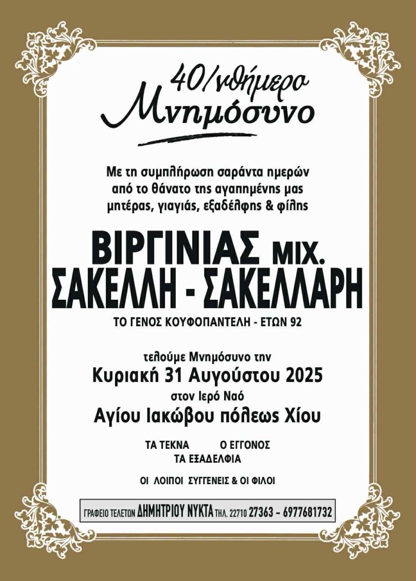 Τελούμε Μνημόσυνο την Κυριακή 31 Αυγούστου 2025 στον Ιερό Ναό Αγίου Ιακώβου πόλεως Χίου
