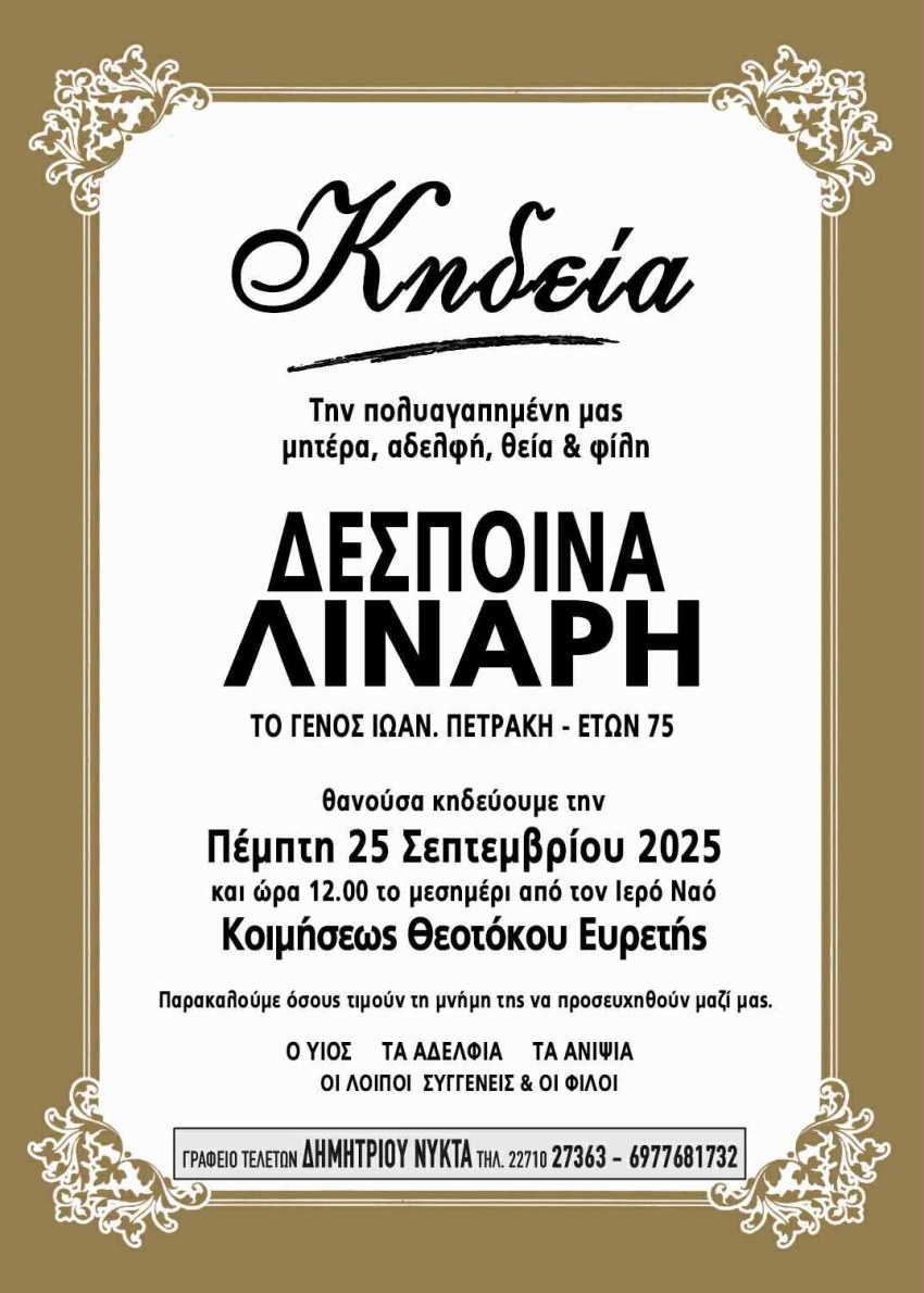 Θανoύσα κηδεύουμε την Πέμπτη 25 Σεπτεμβρίου 2025 και ώρα 12.00 το μεσημέρι