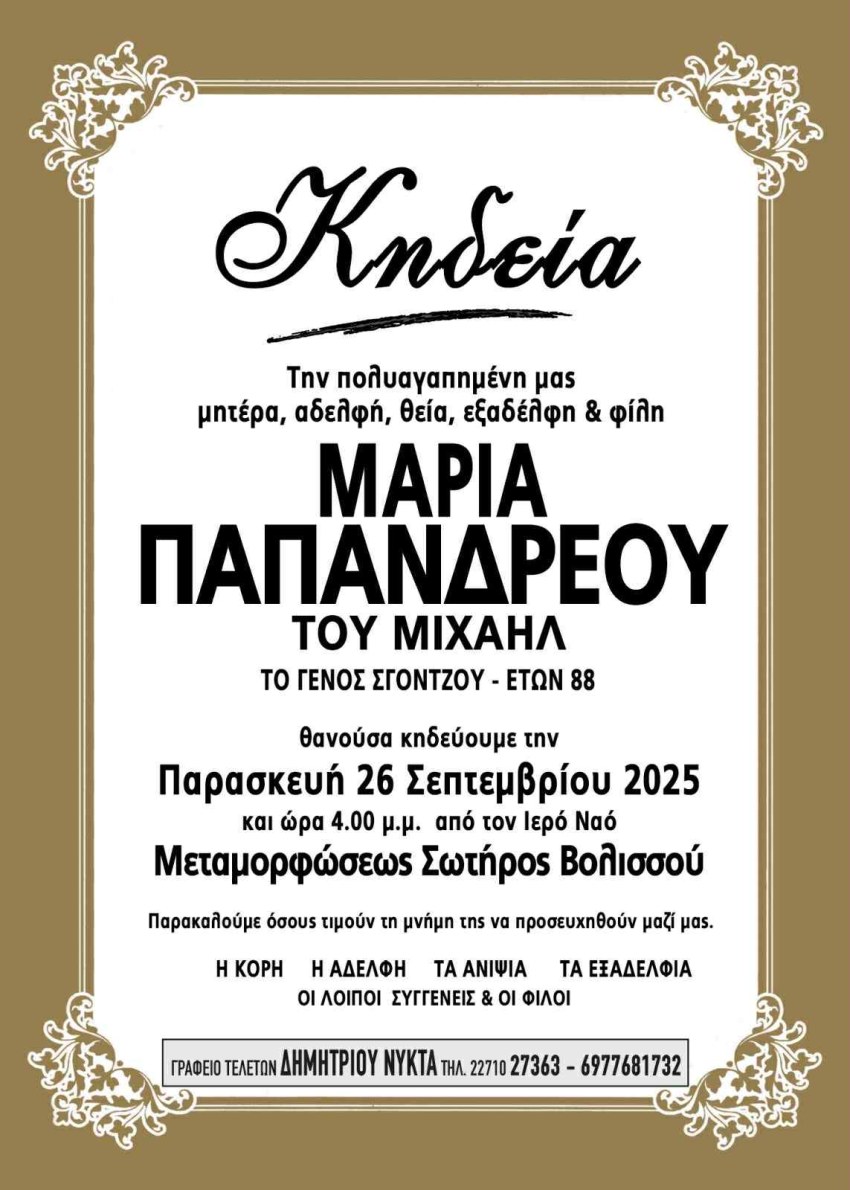 Θανoύσα κηδεύουμε την Παρασκευή 26 Σεπτεμβρίου 2025 και ώρα 4.00 μ.μ.