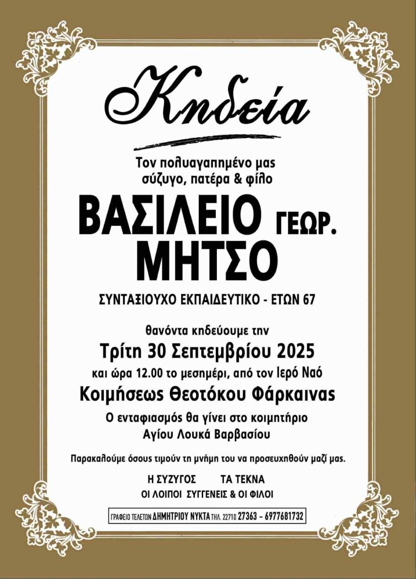Θανόντα κηδεύουμε την Τρίτη 30 Σεπτεμβρίου 2025 και ώρα 12.00 το μεσημέρι