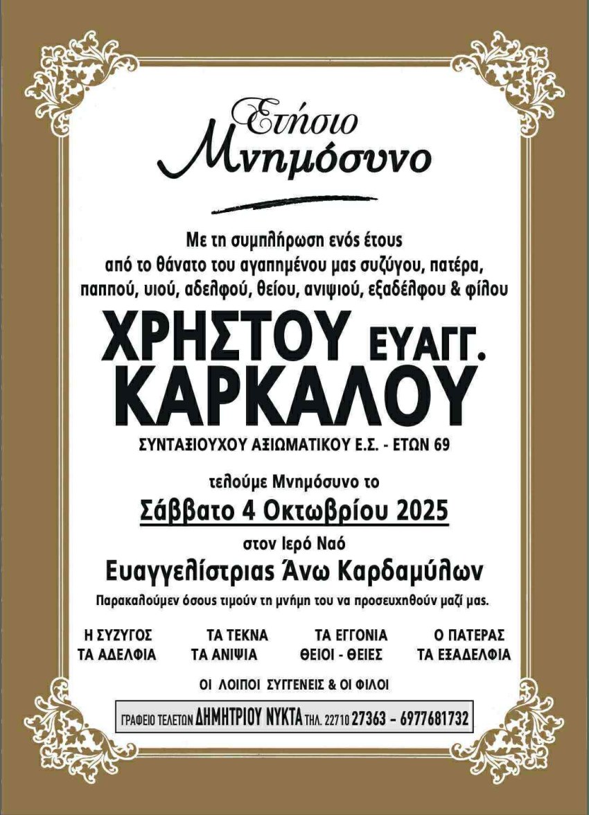Με τη συμπλήρωση ενός έτους από το θάνατο του αγαπημένου μας συζύγου, πατέρα, παππού, υιού, αδελφού, θείου, ανιψιού, εξαδέλφου και φίλου