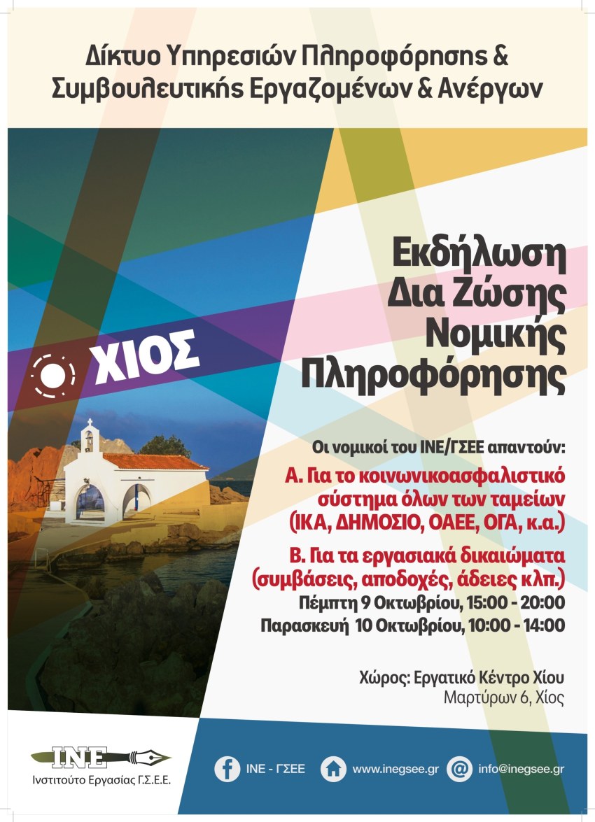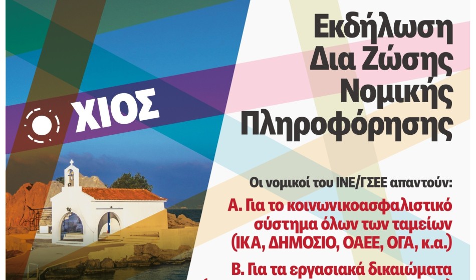 Στο πλαίσιο ενίσχυσης της ενημέρωσης εργαζομένων και ανέργων, το Ινστιτούτο Εργασίας της ΓΣΕΕ Βορείου Αιγαίου σε συνεργασία με το Εργατικό Κέντρο Χίου διοργανώνουν εκδήλωση Δωρεάν Νομικής Πληροφόρησης στο Εργατικό Κέντρο Χίου.