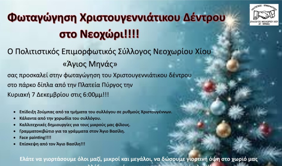 Σε ένα σκηνικό γεμάτο φως, μουσική και χαμόγελα αναμένεται να μεταμορφωθεί το πάρκο δίπλα στην πλατεία «Πύργος» του Νεοχωρίου Χίου, την Κυριακή 7 Δεκεμβρίου 2025, στις 18:00, με αφορμή την εκδήλωση φωταγώγησης του Χριστουγεννιάτικου Δέντρου.