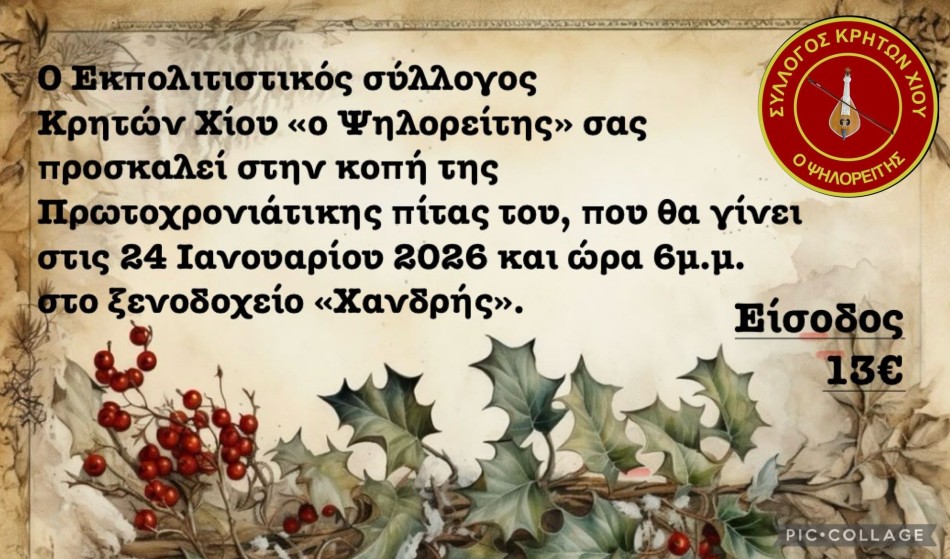 Με τη ζεστασιά της κρητικής παράδοσης και την προσδοκία μιας χρονιάς γεμάτης υγεία και δημιουργία, ο Εκπολιτιστικός Σύλλογος Κρητών Χίου «Ο Ψηλορείτης» προσκαλεί τα μέλη και τους φίλους του στην καθιερωμένη κοπή της πρωτοχρονιάτικης πίτας.
