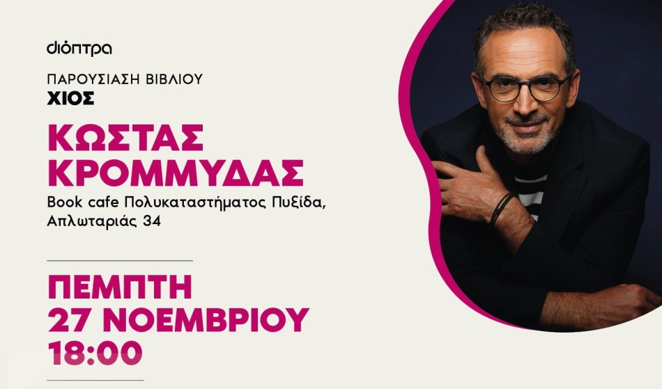 Το νέο του μυθιστόρημα με τίτλο «Ο τρόπος που λες τ’ όνομά μου» παρουσιάζει στο κοινό της Χίου ο πολυβραβευμένος συγγραφέας Κώστας Κρομμύδας, την Πέμπτη 27 Νοεμβρίου 2025, στις 18:00, στο Book Cafe του Πολυκαταστήματος Πυξίδα. Η εκδήλωση, την οποία συνδιοργανώνουν το Πολυκατάστημα Πυξίδα, ο Λαογραφικός Πολιτιστικός Όμιλος Χίου "Λέων Αλλάτιος" και οι εκδόσεις Διόπτρα, θα έχει ελεύθερη είσοδο για το κοινό.