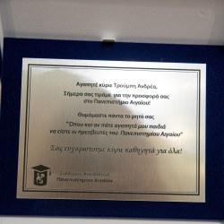 Κορυφαία στιγμή της εκδήλωσης υπήρξε η βράβευση του πρώην Πρύτανη, καθηγητή Ανδρέα Τρούμπη, από τον ΣΑΠΑ, για την πολυετή προσφορά του στο Πανεπιστήμιο. Τον τιμώμενο προσφώνησαν διακεκριμένες προσωπικότητες του ακαδημαϊκού και πολιτικού χώρου, μεταξύ των οποίων ο ομότιμος καθηγητής ΕΚΠΑ και μέλος της Ακαδημίας Αθηνών Γιώργος Χρούσος, ο καθηγητής Παναγιώτης Δημητρακόπουλος, ο καθηγητής Μανούσος Μαραγκουδάκης και ο πρώην βουλευτής και νομάρχης Λέσβου Παύλος Βογιατζής.
