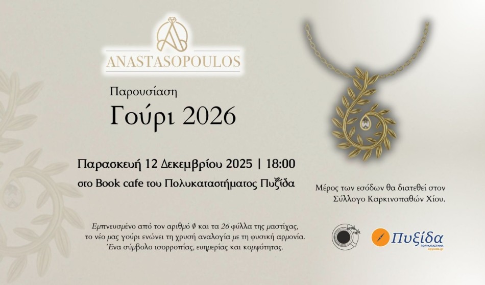Ένα ξεχωριστό πολιτιστικό και αισθητικό γεγονός υπόσχεται η παρουσίαση του νέου «Γουριού 2026» από το Κοσμηματοπωλείο Anastasopoulos, η οποία θα πραγματοποιηθεί την Παρασκευή 12 Δεκεμβρίου 2025, στις 18:00, στο Book Café του Πολυκαταστήματος ΠΥΞΙΔΑ.