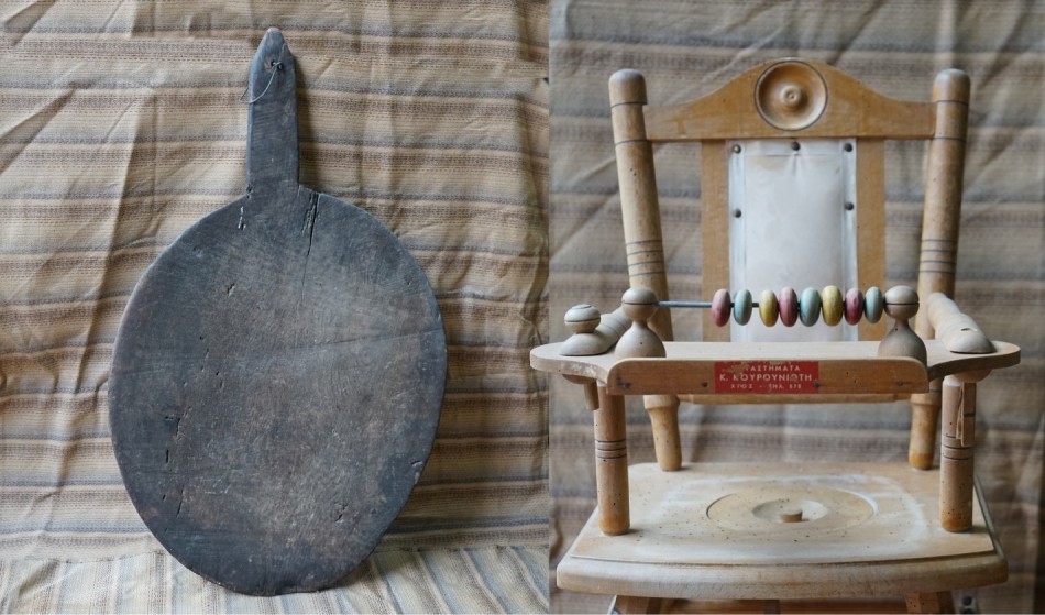 Επίσης ένα χρηστικό αντικείμενο που δεν έλειπε από κανένα σπίτι που είχε νεογέννητα μωρά, ήταν το ξύλινο παιδικό καρεκλάκι. Περίτεχνο και προικισμένο με όλα τα κομφόρ, για όλες τις ανάγκες και τη διασκέδαση του παιδιού. Και αριθμητήριο είχε, και μίνι πτυσσόμενο τραπεζάκι, και παιχνίδια για να παίξει το μικρό αγγελούδι, και γινόταν και κρεβατάκι για να κοιμηθεί. Τέτοιο είναι και το παιδικό καρεκλάκι που είδαμε και στο Παλαιοπωλείο του Κώστα Πνευματικούδη, και ζωντανέψανε τα χρόνια τα παλιά.