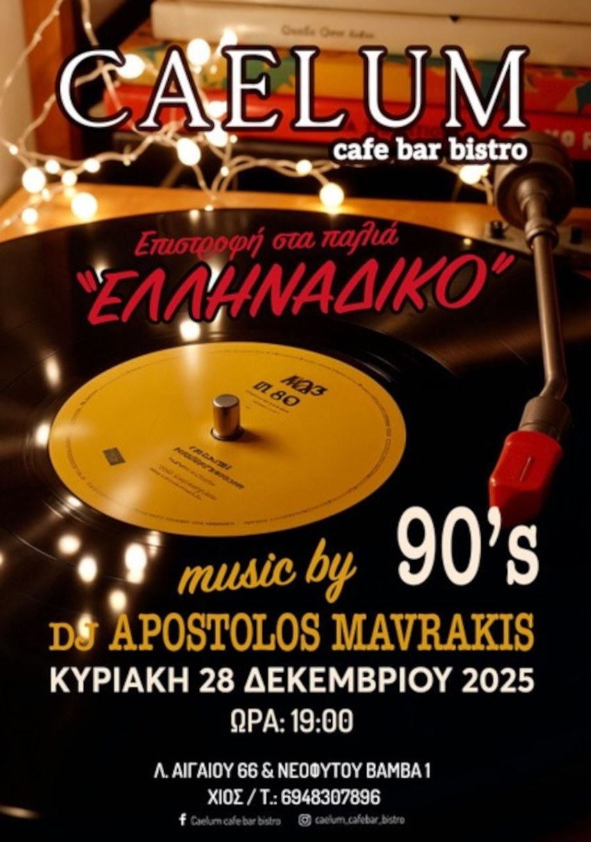 Μετά από δύο Κυριακές που έγινε πραγματικός χαμός, το επιτυχημένο ΕΛΛΗΝΑΔΙΚΟ πάρτι επιστρέφει και αυτή την εβδομάδα στο Caelum Café Bar Bistro, γιατί η ζήτηση ήταν τεράστια και ο κόσμος… δεν χωρούσε! Από νωρίς, ο χώρος γεμίζει, η διάθεση ανεβαίνει και η πίστα παίρνει φωτιά με δυνατά ελληνικά hits και 90’s vibes, σε ένα πάρτι που απευθύνεται σε όλες τις ηλικίες και κυρίως σε όσους θέλουν να χορέψουν πραγματικά και να περάσουν καλά.