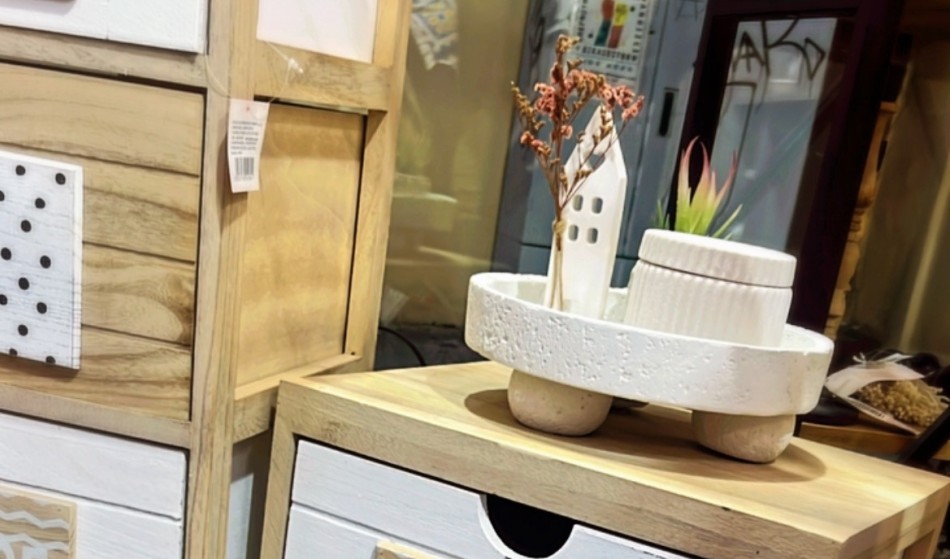 Πλεκτοί ανανάδες, καλαθάκια macramé, κεραμικά βάζα και φιγούρες σε γήινες αποχρώσεις συνδυάζονται με τεχνητά φυτά και ελαφριές λύσεις αποθήκευσης, δημιουργώντας ένα ζεστό αλλά ανάλαφρο αποτέλεσμα.