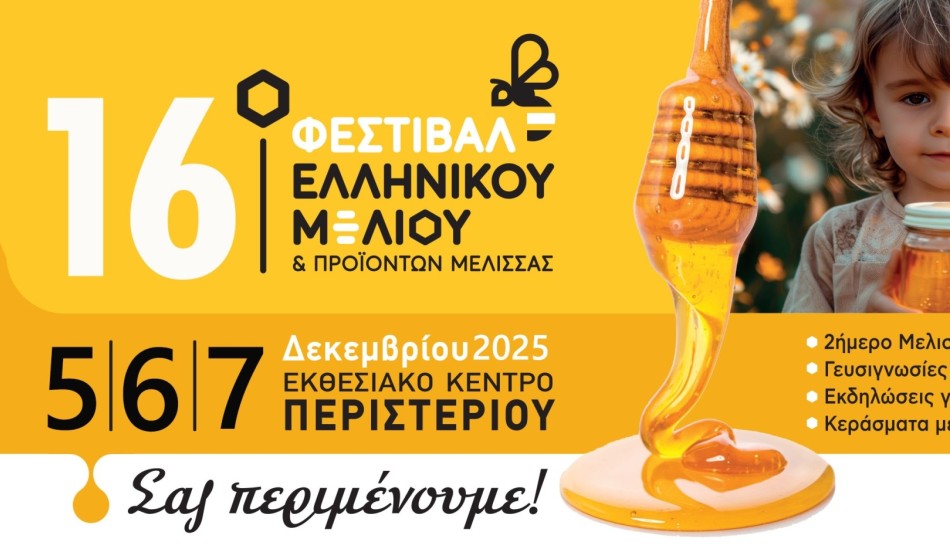 Με πολυπληθή συμμετοχή της Περιφέρειας Βορείου Αιγαίου και παραγωγών από νησιά όπως η Λέσβος, η Χίος, η Σάμος, η Ικαρία, τα Ψαρά και οι Φούρνοι Ικαρίας, θα πραγματοποιηθεί στις 5, 6 και 7 Δεκεμβρίου 2025 το 16ο Φεστιβάλ Ελληνικού Μελιού & Προϊόντων Μέλισσας, στο Εκθεσιακό Κέντρο Περιστερίου.
