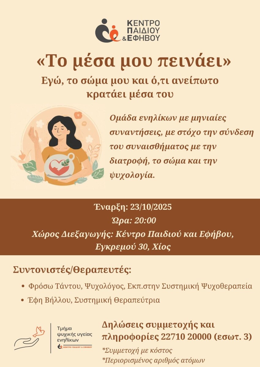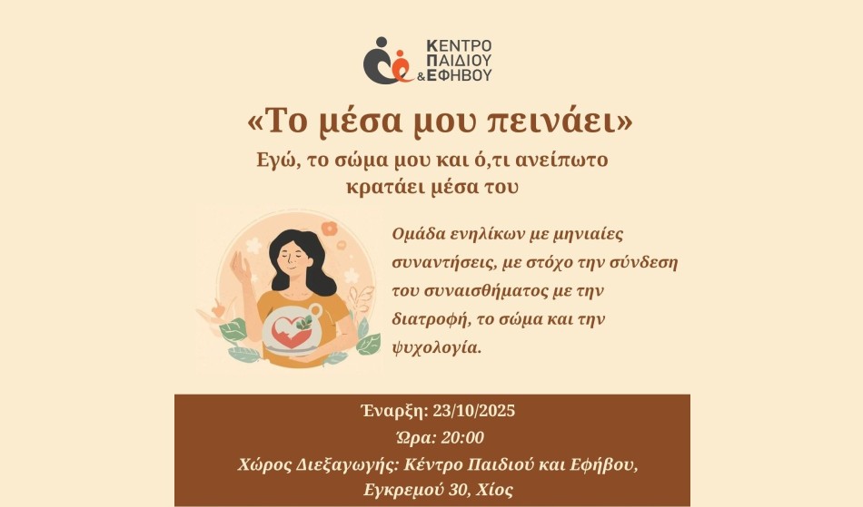 Η ομάδα «Το μέσα μου πεινάει» προσφέρει έναν ασφαλή και υποστηρικτικό χώρο για όσους/όσες αντιμετωπίζουν διατροφικές δυσκολίες. Μέσα από τις συναντήσεις, οι συμμετέχοντες μπορούν να μοιραστούν τις εμπειρίες τους, να κατανοήσουν καλύτερα τη σχέση τους με το φαγητό και το σώμα τους και να βρουν τρόπους να φροντίσουν τον εαυτό τους, τόσο σωματικά όσο και ψυχικά.